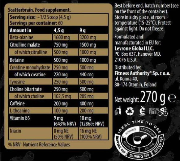 Pre-Workout Scatterbrain de la Kevin Levrone este un supliment pre-workout conceput pentru a îmbunătăți performanța fizică și concentrarea în timpul antrenamentelor intense. Produsul combină ingrediente care susțin energia, rezistența și concentrarea mentală pentru a oferi un antrenament excelent.